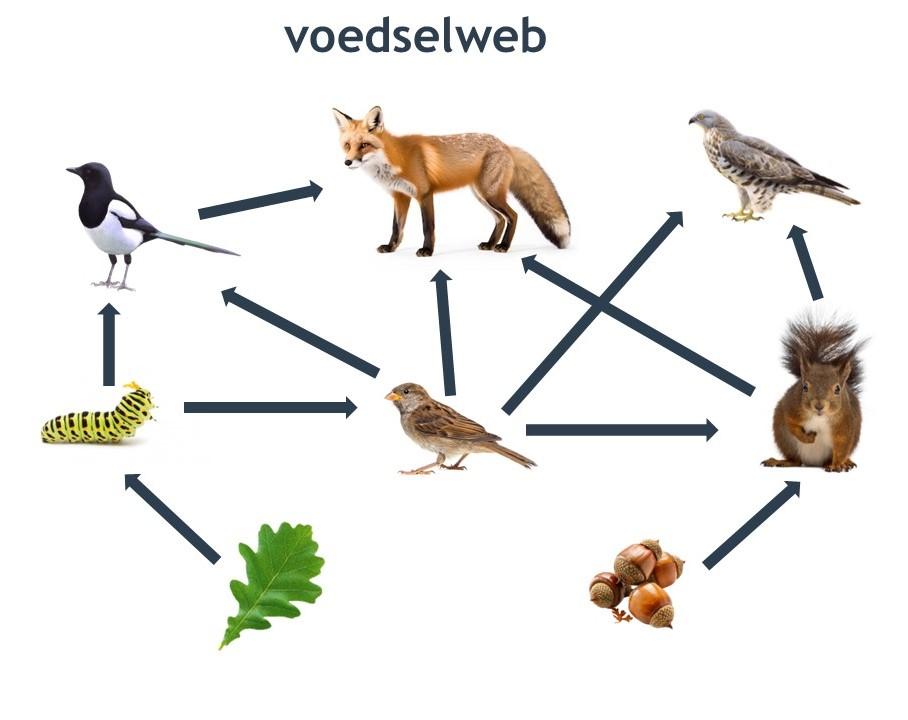 Op deze afbeelding zie je een voorbeeld van een voedselweb.