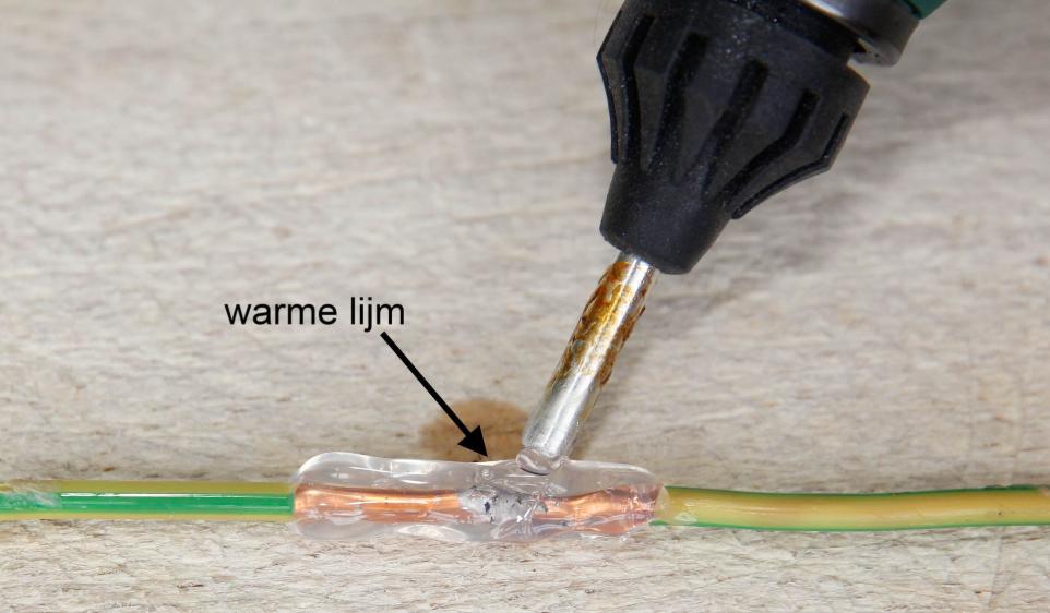 - Daarna doet hij warme lijm over de koperdraden. (foto 3)